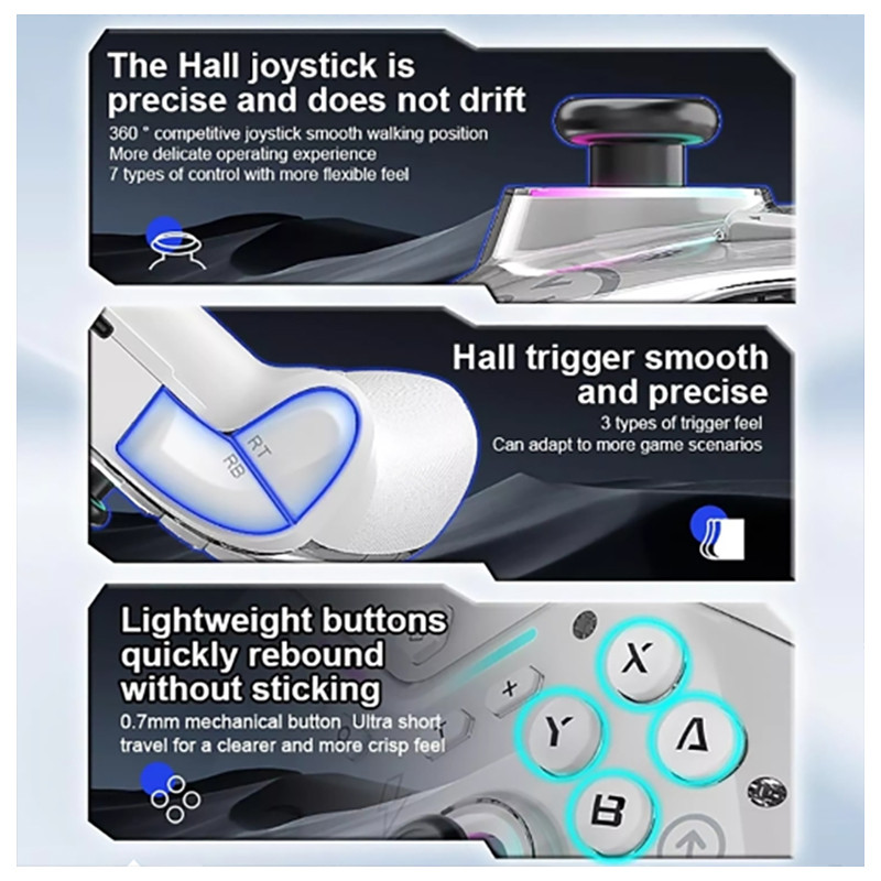 گیم پد مدل CM-617 با طراحی خاص و ظاهری زیبا برای استفاده در انواع گوشی موبایل ، تبلت و لپ تاپ و Steam طراحی و ساخته شده است. این کنترلر حرفه ای دارای باتری داخلی بوده و و از طریق کابل شارژ Type-C که داخل بسته بندی قرار گرفته شارژ می شوند. این دسته درای 2 موتور شوک و باتری با ظرفیت 600 میلی آمپر از نوع پلیمری می باشد.